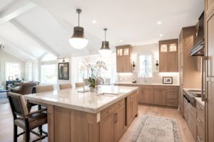 The cabinetry features rift-sawn white oak with an aged cedar finish that adds warmth. The door style with 2″ stiles and rails provides a modern interpretation of traditional design. Modified base cabinets deliver multiple storage solutions. White quartzite countertops and matching backsplash complete the bright, inviting transformation.